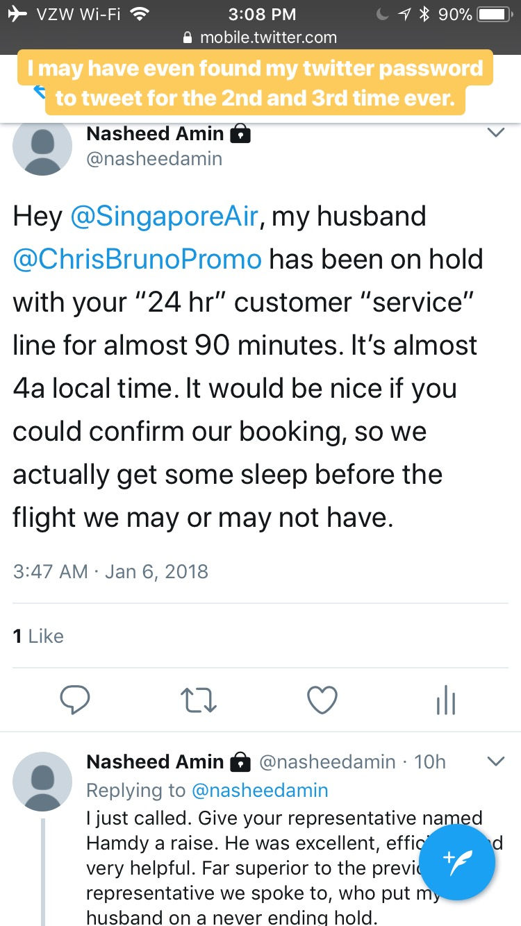 While he is on hold, I suggest we finish watching the last episode of The Crown we were on, since there is nothing else we can really do until Singapore finalizes the options. Not interested. Then, they keep him on hold. That’s when I knew it was bad. I suggest that I also call. While I’m on hold, I tell the airline how I feel on Twitter.